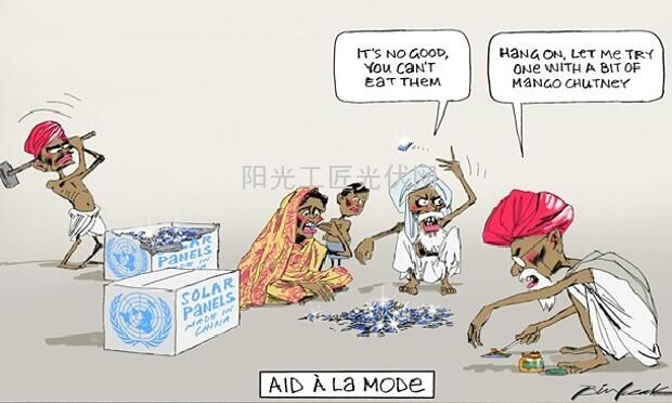 这幅由《澳大利亚人报》自身漫画人比尔˙里克(BillLeak)绘制的社评漫画描述了这样的场景:几名饥饿的印度人将太阳能电池板敲碎后当食物吃下。显然,在巴黎气候大会的背景下,印有联合国图标的包装箱意指由联合国向发展中国家提供的减排援助品。画中面容憔悴的饥民衣衫褴褛,但呈现鲜明的印度特征,其中一人说”这东西不能吃”,另一人应道:“别急,让我蘸芒果酱试试。”