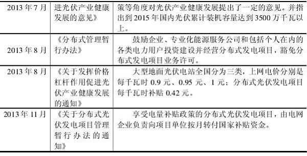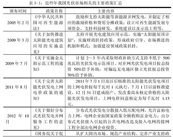 目前,推广光伏发电己经被列入我国国家长期发展战略之中,政府也相应出台了很多与此相关的政策法规(参见表3-1),尤其从2011年开始光伏产业遇到发展困境后,更是进入光伏政策密集出台期,为我国拓展国内光伏市场创造了良好的政策环境。