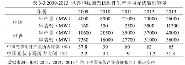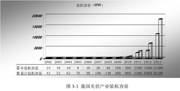 从2009年到2013年我国光伏装机容量的增长来看,我国光伏市场进入快速发展阶段,2009年至2013年的年均增长率达到200%,以往光伏市场严重落后于光伏产业发展的状况有了很大改变。从表3-2中可以看出,2009年,我国国内的光伏系统装机容量为160MW,只占我国光伏组件产量的4%02013年,我国的光伏组件生产量为26000MW,而年装机容量11300MW,己经占到总产量的43.4%。如表3-2所示: