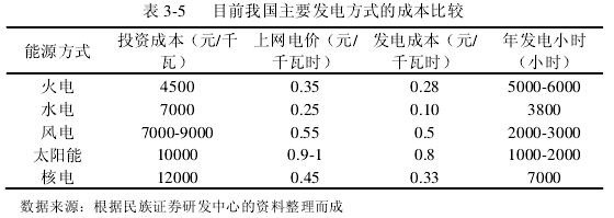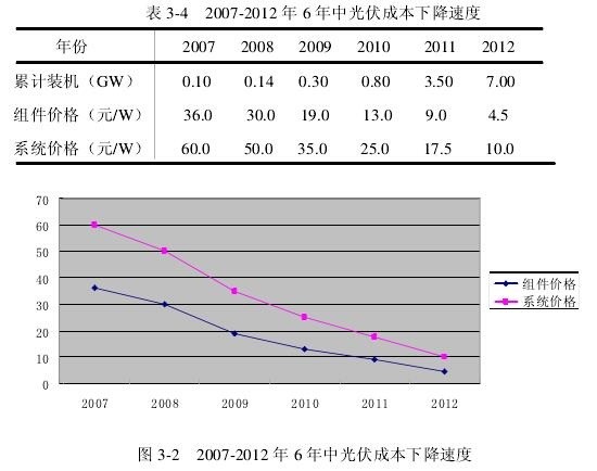 由于我国光伏产业产能过剩、产品出口欧美市场受阻、技术进步等原因,近几年光伏发电系统建设成本一直呈大幅下降趋势(如表3-4和图3-2。目前我国光伏发电的初始投资成本大约为10000元/千瓦,光伏发电成本约为0.8元/度,这种成本虽然己经低得接近极限且建立在光伏全行业全线亏损的基础之上。但是在发电成本方面,光伏发电与水电,核电和风电等其他新能源形式相比没有优势可言,与传统的火电比较更是相去甚远。在初始投资成本方面,也仅比核电低。因此,光伏发电之所以没有在我们生活中得到普遍应用,归根结底就是由于成本高。详见表3-5