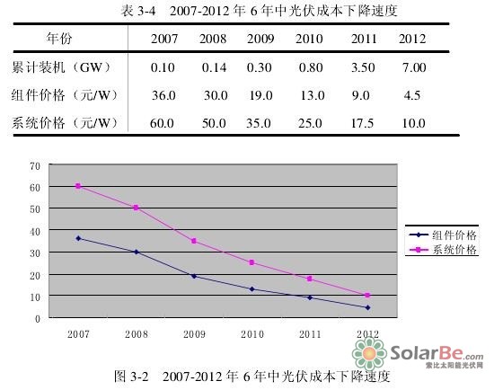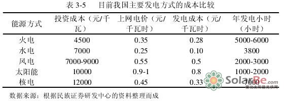 由于我国光伏产业产能过剩、产品出口欧美市场受阻、技术进步等原因,近几年光伏发电系统建设成本一直呈大幅下降趋势(如表3-4和图3-2。目前我国光伏发电的初始投资成本大约为10000元/千瓦,光伏发电成本约为0.8元/度,这种成本虽然己经低得接近极限且建立在光伏全行业全线亏损的基础之上。但是在发电成本方面,光伏发电与水电,核电和风电等其他新能源形式相比没有优势可言,与传统的火电比较更是相去甚远。在初始投资成本方面,也仅比核电低。因此,光伏发电之所以没有在我们生活中得到普遍应用,归根结底就是由于成本高。详见表3-5