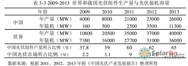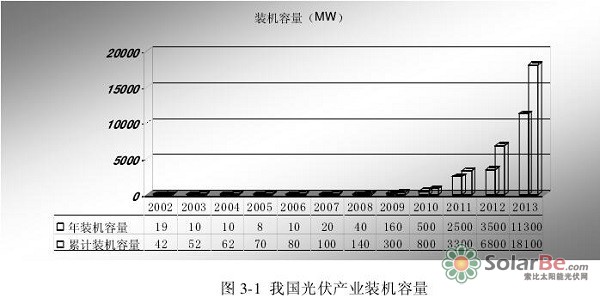 从2009年到2013年我国光伏装机容量的增长来看,我国光伏市场进入快速发展阶段,2009年至2013年的年均增长率达到200%,以往光伏市场严重落后于光伏产业发展的状况有了很大改变。从表3-2中可以看出,2009年,我国国内的光伏系统装机容量为160MW,只占我国光伏组件产量的4%02013年,我国的光伏组件生产量为26000MW,而年装机容量11300MW,己经占到总产量的43.4%。如表3-2所示: