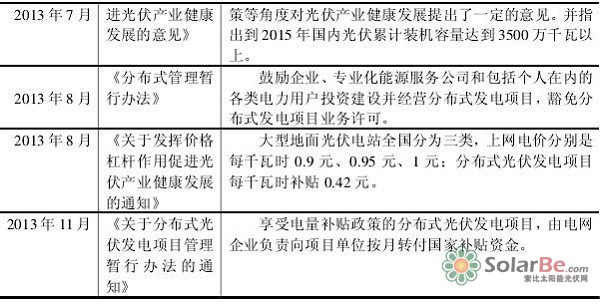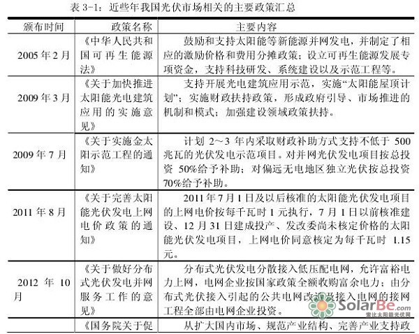 目前,推广光伏发电己经被列入我国国家长期发展战略之中,政府也相应出台了很多与此相关的政策法规(参见表3-1),尤其从2011年开始光伏产业遇到发展困境后,更是进入光伏政策密集出台期,为我国拓展国内光伏市场创造了良好的政策环境。