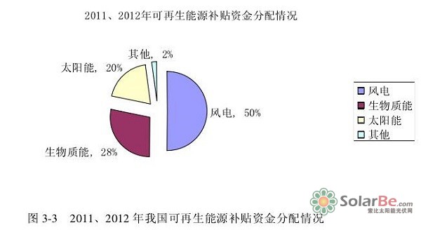 再看补贴政策,一是国家如何保证补贴资金来源。光伏补贴资金主要来自可再生能源电价附加,国家财政拨款占较小比重。2013年7月15口,国务院发布的《关于促进光伏产业健康发展的若干意见》中指出,到2015年中国光伏总装机容量要达到3500万千瓦(35GW)以上。截止到2013年底,我国光伏累计装机量约为18.1GW,每年可发电1100亿一1200亿度,按照0.42元/度的补贴计算,相应需要400多亿元补贴。若完成35GW的装机量则年发电可达到2000-2500亿度,每年需要的补贴为840w~1050亿元。按照2013年9月25口起开始执行的每度电1.5分钱的可再生能源电价附加标准(之前是0.8分)和2013年全社会用电量53223亿千瓦时计算,电价附加收入仅为800亿元。需要指出的是电价附加的征收不是只为光伏设立的,是为可再生能源,算上风能、生物质能等,真正能留给光伏行业的款项非常少(如图3-3)。而且电价附加仅对除居民生活和农业生产以外的其他用电征收。目前光伏补贴资金己经出现缺口,到了2015年,资金缺口只会更大。二是政府如何保证补贴资金公平、足额、按时、持久发放。补贴拖欠问题在我国己建成的大型地面光伏电站中普遍存在,可以说由来己久。大型地面光伏电站的建设和运行需要占用大量资金,补贴不到位,电站所发电量卖给电网只能得到0.4~0.5元的脱硫销售电价,所得资金甚至连偿还贷款利息和维护电站口常运行都不够。投资者不仅无法通过建设光伏电站获利,还很有可能出现亏损。这种状况无疑会影响其他投资者建设光伏电站的积极性。