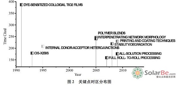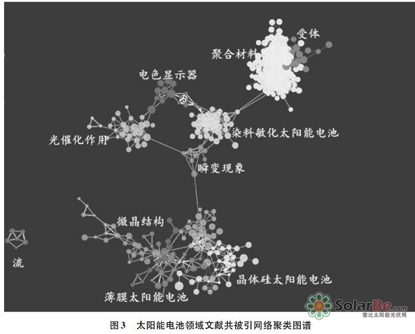 可视化分析结果(见图1)显示,太阳能领域研究形成了清晰的文献共被引网络,整体上反映了该领域从分散到集中、从基础到应用的发展脉络。