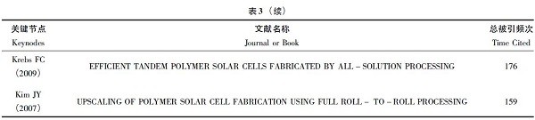 在排名前10的节点文献中,M.Jorgensen的研究探讨了聚合物太阳能电池的稳定性和退化机理,是其中惟一一篇关注太阳能电池可靠性的文献,却以219次的总被引频次居第4位。同时,以该节点为中心,衍生出结构完整的文献共被引网络,更说明其研究内容代表了2008年以后太阳能电池领域一个重要的研究方向。分析该领域早期文献不难发现,多数研究致力于提高材料的光电转换效率,对其他指标要求不高。从科学技术发展的角度来看,在新技术的发展初期,人们往往只关心与其性能密切相关的最主要指标,具体到太阳能电池,这一最主要指标即为光电转换效率,因此到21世纪之前,本领域的研究仍仅着眼于材料的光电转换性能;随着技术的不断发展,技术本身逐渐满足了核心性能要求,而为了能够将其应用,需要综合考虑其他性能指标,以保证产品高效平稳运行,因此自2005年至今,出现了大量以满足大规模生产制造要求、延长电池使用寿命为目的的研究成果,标志着太阳能电池技术逐渐走向成熟,也就要求构建更加完善的指标体系来促进其发展。