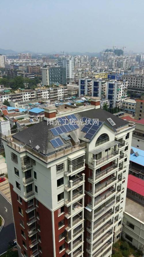分布式光伏系统服务商晶科光伏承建,总装机容量为5.3KW,20块265W的高效多晶组件沿屋顶铺于11层楼高的公寓楼顶,蓝色的方块形成一道别具特色的风景线。