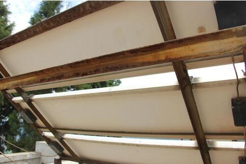 图:在户外近20年后,支架已见锈迹斑斑,但基于杜邦™ 特能®(Tedlar®)PVF薄膜的背板外观无明显变化。经检测,黄度b*值变化仅为1.6-1.8,证明其优异的耐候性。
