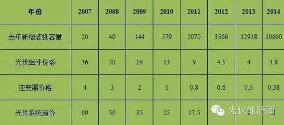 其次,没有无缘无故的补贴,也没有无缘无故的下调。光伏上网电价的下调是建立在光伏系统成本下降的基础上的。下表为2007年~2014年,光伏电站造价的变化情况。