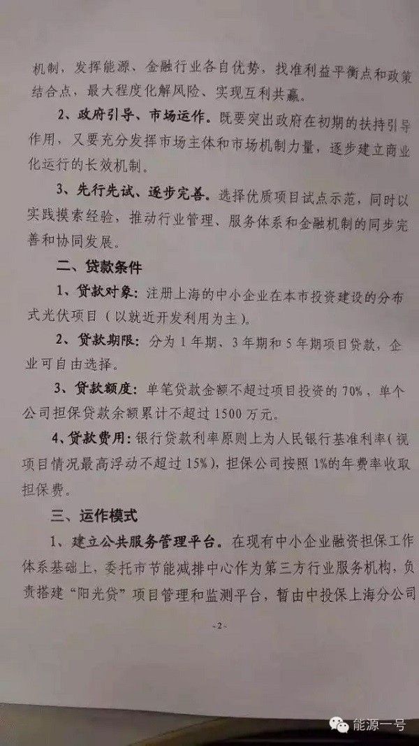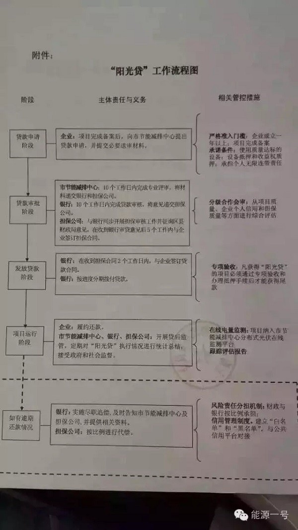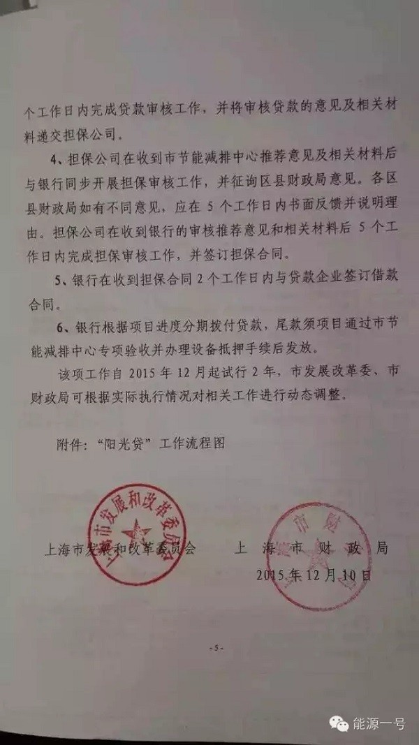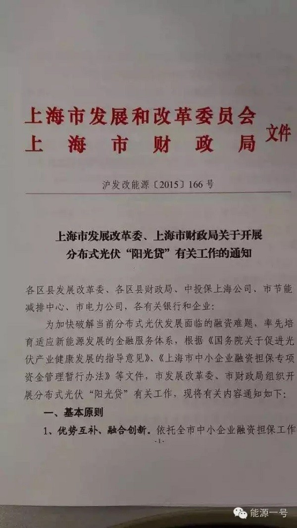 12月16日下午,“能源一号”从权威部门获得确认,上海市发改委联合上海市财政局已发布了一则文件,通过“阳光贷”这一新政力促解决分布式光伏的贷款问题。