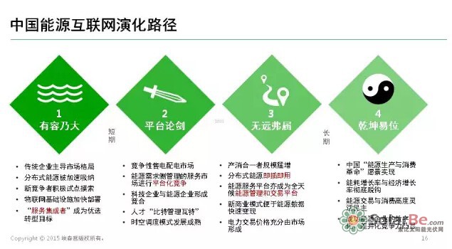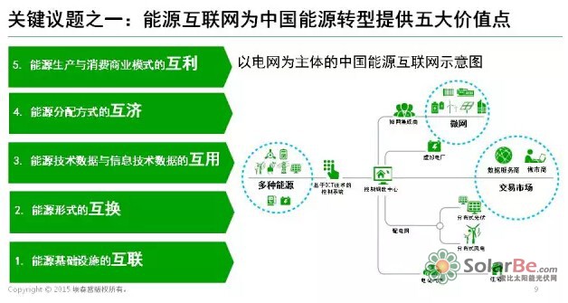 对于艰难推进能源转型的中国而言,德国模式提供了很好的样板。而能源互联网则为转型提供了完整的思路。第一,能源基础设施的“互联”。通过电网或通过电动汽车,从上游的油气和发电到终端消费者,把每个企业、每个商户、每个居民用户连接起来。第二,能源形式的“互换”。在以微网和冷热电三联供和各类储能技术加速进步的情况下,不同形式的能源转换将成为可能,使能源用户的用能选择更加多样、成本下降、效率提升。第三,能源技术数据和信息技术数据的“互用”。能源互联网的核心技术之一是物联网。我们熟知的智能电网、智能制造、机器和机器的对话都将针对能源企业和用户的新需求而迭代更新。人工智能、生产自动化与信息技术、互联网技术的互相融合会为能源行业全面提升生产力。第四,整个网络中能源分配方式的“互济”。能源互联网要解决的问题是如何帮助供需双方实时互动,平衡能源生产和消费,跨越时间和空间地调剂有限资源。第五,能源生产消费和商业模式的“互利”。能源互联网将产生颠覆式创新和全新的商业生态,但新进入企业和传统企业之间并不是赢者通吃的零和游戏。作为彼此平等的能源产消共同体,各企业将运用互联网资源、用户资源和能源资源各自进行差异化定位、互利共赢。