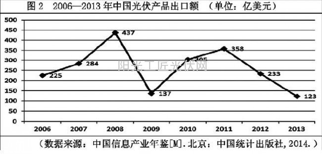 由图2可以看出自2006—2008年我国光伏产品出口增长迅速,2008年达到了437亿美元,可见外国市场对我国光伏产品需求量巨大,但是,在2009年美国金融危机和2011年底开始的欧盟与美国相继对华光伏反倾销使得中国光伏产品出口急剧下降,由此可以浅显的看出,外国市场稍有变化就会对中国光伏产业产生甚大影响,中国光伏产业对外依存度非常高。由于国外市场的广阔,使得光伏企业忽略了并且不愿对国内市场进行开发。