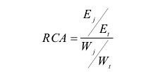 显示性比较优势指数(RCA)指数可以描述为一个国家或地区特定产品的出口额在该国总出口额中的占比与该产品的世界出口总额占所有产品的世界出口额的份额的比率。用公式表示为: