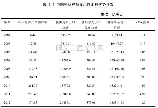 其中,Ej,Ei,Wj,Wi分别表示一国J商品的出口额一国商品出口总值、世界J商品的出口额和世界商品出口总值。日本贸易振兴协会对显示性比较优势指数分为五类,即RCA>1,RCA>2.5,1.25<RCA<2.5,0.8<RCA<1.25,RCA<0.8。总体来说,数值越大,比较优势越明显。下表反映了中国在光伏产品出口方面的竞争力。