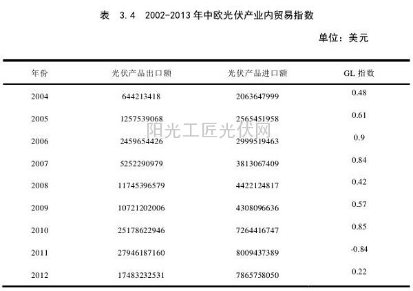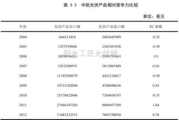 式中jE、jI分别代表特定商品j的出口值和进口值。其取值范围为(-1,1)如果TC指数为正,表明该国j商品具有较强的出口竞争力,该产业在国际竞争中也较强;反之,出口竞争力较弱,该产业的国际竞争力较弱;TC值越接近于1竞争力越强,越接近于一1竞争力越弱。下表3.3表明TC指数大部分均在一1左右,反映出我国光伏产业相对竞争力较弱,虽然显示性比较优势指数较高反映出我国光伏产品的竞争优势,然而,我国光伏产业“两头在外”不平衡的发展模式可以从TC指数中看出。