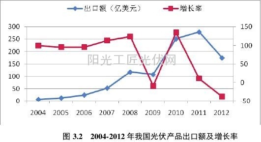 然而,我国光伏产品主要靠海外市场的需求,每年约95%光伏产品出口海外,其中电池组件70%多是销往欧洲市场的,从依赖程度看,有的企业高度依赖欧洲市场,达到了90%多,2011年我国光伏产品出口额约358亿美元,其中60%以上出口至欧洲大陆。