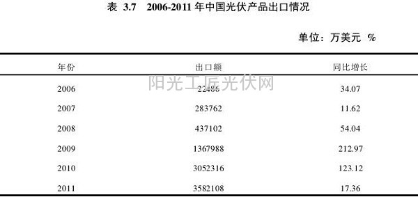 我国光伏企业靠承接欧美市场对光伏产品的需求从事光伏产品的组装,属于劳动密集型产业。自2005年开始,我国光伏产业以欧美光伏产业发展为契机,大力发展太阳能光伏产品,同时带动了多晶硅产业的发展。我国光伏产品出口能力旺盛,在短时间内迅速拓展市场。