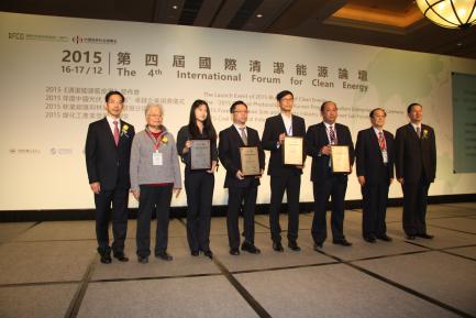 中国光伏“领跑者”卓越组件企业获奖企业代表与颁奖嘉宾中国科学院院士何祚庥、中联办秘书长王新东、澳门基金会行政委员会副主席张裕、国际清洁能源论坛(澳门)常务副理事长袁国林合影。