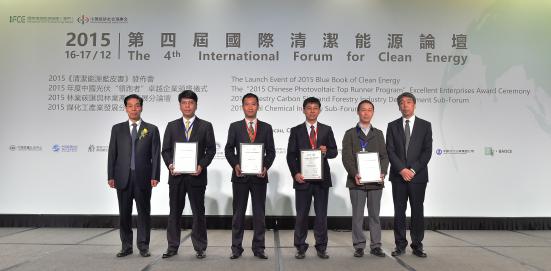 中国光伏“领跑者”卓越材料供应商获奖企业代表与颁奖嘉宾澳门中华总商会副理事长黄国胜、澳门特别行政区政府能源业发展办公室副主任卢深昌、国际清洁能源论坛(澳门)理事长、全国政协委员苏树辉合影。