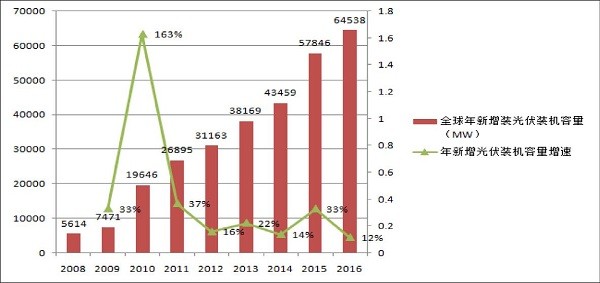 2.3、2016年全球新增光伏装机将达到64.54GW