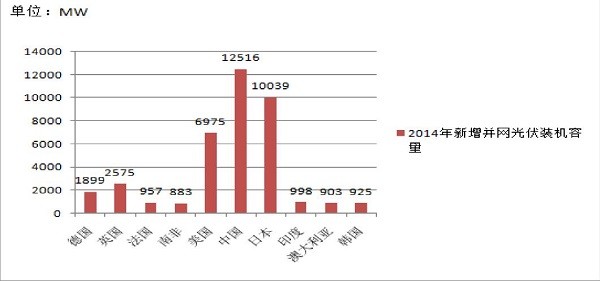 图2.1.2.2014年中国年新增并网光伏装机容量全球第一