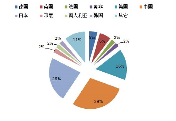 图2.1.3.2014年各国年新增并网光伏装机总量占全球新增并网光伏装机比重