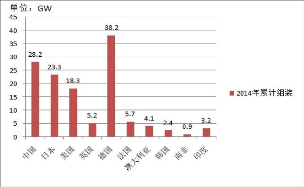 截至2014年底,全球累计光伏装机总量最高的国家为德国,总量为38.2GW。中国以28.2GW的装机容量位居德国之后。其次为日本、美国、法国、英国、澳大利亚、印度、韩国、南非。