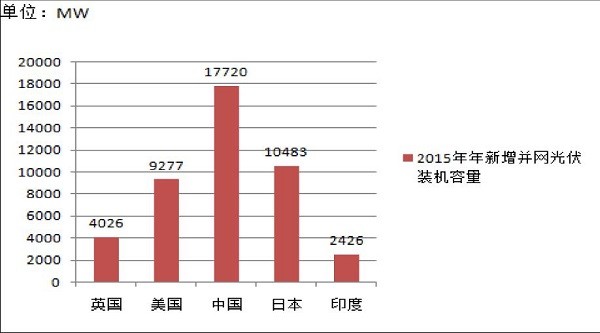 2015年中、美、日与新兴市场引领全球光伏发电装机增长。国际能源咨询机构IHS预计2015年全年中国新增并网光伏装机总量为17720MW,位于全球之首。日本新增并网光伏装机容量10483MW,仅次于中国。美国新增并网光伏装机容量为9277MW,位于世界第三位。英国新增并网光伏装机容量为4026MW,位于全球第四。印度新增并网光伏装机容量为2426MW,位于全球第五位,居于德国之前。