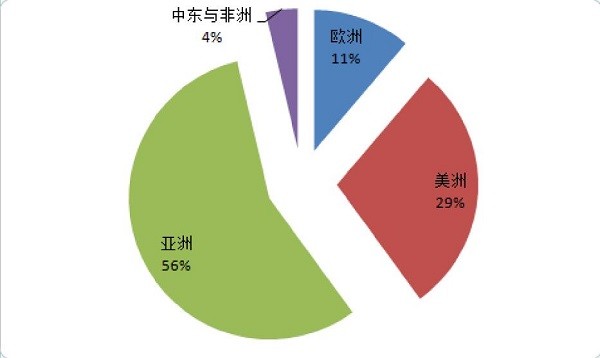 2016年,IHS预计全球新能源政策将保持不变,在友好的政策环境下,全球新增并网光伏装机总量有望突破64.54GW。其中,亚洲、美洲、欧洲、中东与非洲地区年新增并网光伏装机总量分别为36358MW、18573MW、7231MW、2375MW。这四个地区年新增并网光伏装机容量占全球新增装机的比重将分别为56%、29%、11%和4%。
