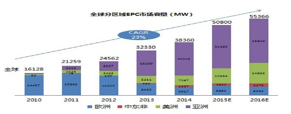 据全球权威咨询机构IHS的统计2014年全球新增EPC市场容量为38360MW,与2010年的16128MW相比,年复合增长率高达24%。同时,2015年将是全球新增EPC市场容量增长最快的一年,市场规模将达到51GW,较2014年增长25%。IHS预计2016年全球新增EPC市场容量将达到55366MW,同比上涨8.5%。