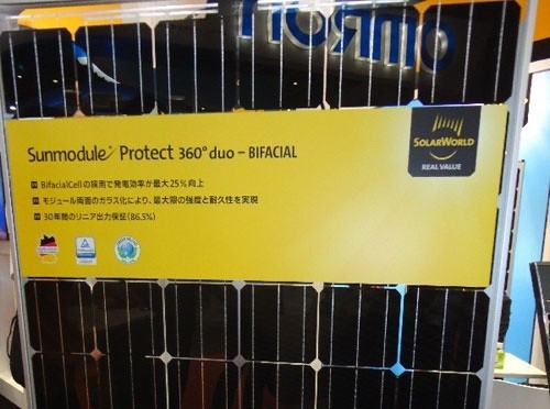 Solar World公司通过采用双面发电电池单元,使输出功率最大可提高25%,据称,275W产品(1675mm×1001mm×33mm)最大实现了337W的输出。