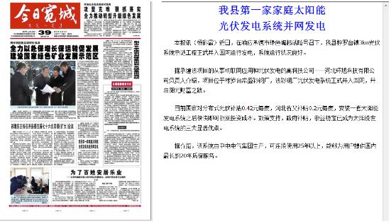 索比光伏网讯:近日,河北宽城县的一户太阳能光伏电站上报了!在响应承德市绿色崛起战略号召下,该县首个3kw光伏系统示范工程正式并入国网运行发电,系统运行状况良好,吸引了当地居民和媒体的关注。