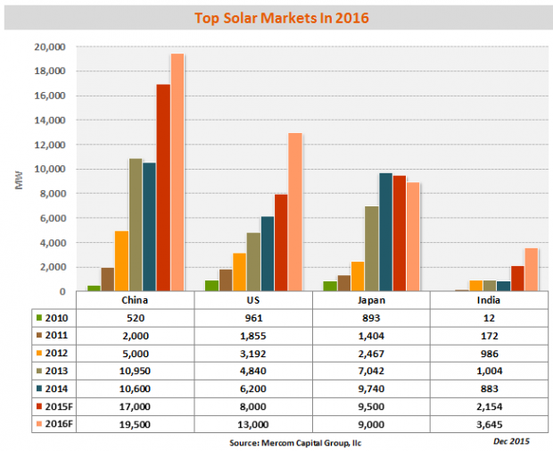 Mercom预计2016年中国将安装19.5GW。前三季度,中国完成新增装机容量是2015年设定的17.8GW目标的很大一部分。