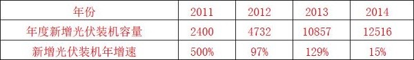 图1.1.1中国2011-2014年年新增光伏装机容量快速上涨