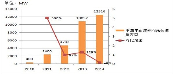 2014年,中国政府出台一系列政策扶持光伏发电,年新增并网光伏发电装机达到12516MW,同比上涨15%。