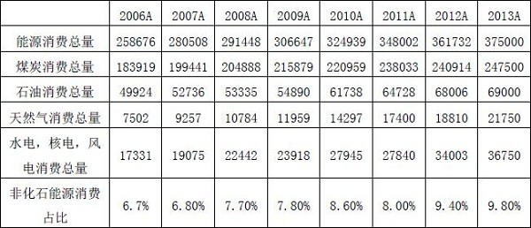 表2.1.12006-2013年中国能源消费及非化石能源消费比重单位:万吨标准煤