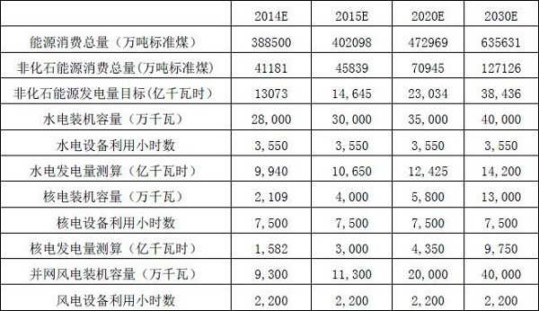 根据《能源发展“十二五”规划》,我国在2015年非化石能源消费比重目标为11.4%;根据《国家应对气候变化规划(2014-2020年)》,我国到2020年非化石能源占一次能源消费的比重达到15%左右;根据《中美气候变化联合声明》,中国计划2030年左右二氧化碳排放达到峰值且将努力早日达峰,并计划到2030年非化石能源占一次能源消费比重提高到20%左右。国家对于未来中长期的能源规划非常清晰。