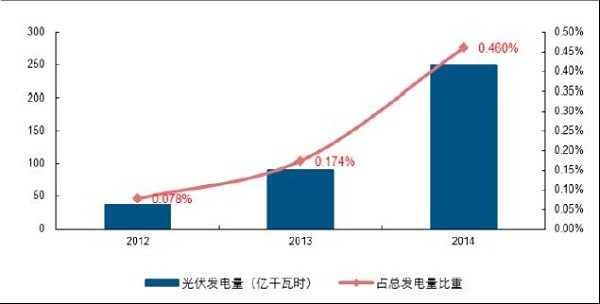 2002年的“送电到乡工程”揭开了我国分布式光伏发电的序幕。2011年、2012年、2013年、2014年中国年新增并网光伏装机总量分别为2.4GW、4.732GW、10.857GW和12.516GW。同比增速分别为500%、97%、129%和15%。