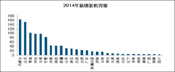 图2.3.52014年中东部的江苏、河北、安徽等新增装机量均位居前列(万千瓦)