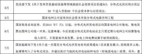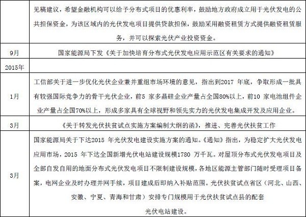 从2013年到2015年,国家能源局出台了一系列政策支持光伏发电行业。其中,2014年9月4日国家能源局印发的《关于进一步落实分布式光伏发电有关政策的通知》(下称《通知》),明确政府对分布式光伏的长期支持态度,并针对光伏行业存在的一系列难题开出“全额上网”电站享受标杆电价、增加发电配额、允许直接售电给用户、提供优惠贷款、按月发放补贴等一系列新政。