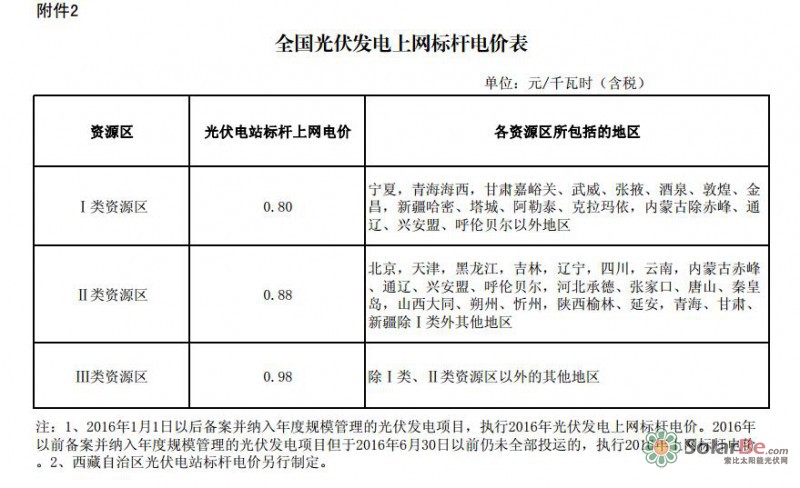 通知中明确调整了风电和光伏发电的标杆电价,除西藏地区外,2016年1月1日以后备案并纳入年度规模管理的光伏发电项目,以及之前备案并纳入规模管理却在2016年6月30日以前不能全部投运的的光伏发电项目也要执行2016年光伏发电上网标杆电价。