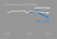 作为基准年的2013年,日本是全球第五大温室气体排放国,二氧化碳排放增加到14.1亿立方吨,达到历史第二高值。与京都议定书的基准年1990相比,日本的减排目标仅为18%,而欧盟是40%。核难对日本能源政策造成了长期的影响。在福岛第一核电站事故发生的4年半之后,日本仍在努力制定一套可信、可负担的能源政策。日本向联合国汇报称,由于2011年核难,日本面临着能源环境的巨大变化,在此之前核能为日本供应着近三分之一能源需求,而这还有望增加至一半。核难导致日本48个工作中的反应堆陆续关闭,根据修改的监管制度接受安全检查。日本西南部仙台核电厂的反应堆于8月重新上线,标志着近两年来日本首次生产核能。其他20个核能再发电重启也在计划之中。在所有核反应堆停产期间,日本被迫进口大量天然气、石油和煤炭。领导层相信日本必须减少对昂贵的化石燃料的依赖以提振经济,履行其气候变化承诺。