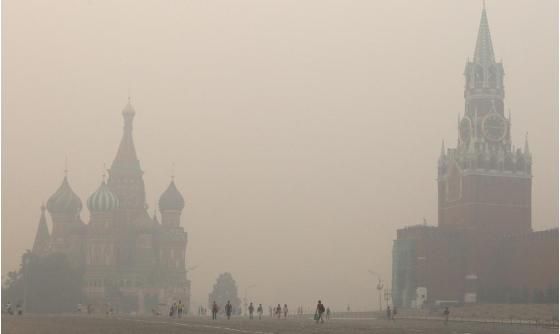游客在浓雾中穿越红场。浓雾由莫斯科中部的泥炭火引起