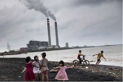 儿童在爪哇中部一个煤电厂周围玩耍。