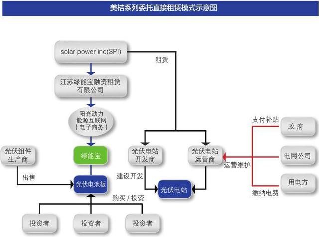 就“美桔系列”而言,SPI首先承担了一个电子商务平台的功能,投资者通过该平台从光伏组件供货商手中购买电池板,再将这些电池板委托给SPI旗下的融资租赁公司(江苏绿能宝融资租赁公司)进行出租,租给光伏电站开发、运营商,让他们来建设电站并运营。