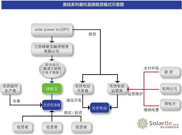 就“美桔系列”而言,SPI首先承担了一个电子商务平台的功能,投资者通过该平台从光伏组件供货商手中购买电池板,再将这些电池板委托给SPI旗下的融资租赁公司(江苏绿能宝融资租赁公司)进行出租,租给光伏电站开发、运营商,让他们来建设电站并运营。