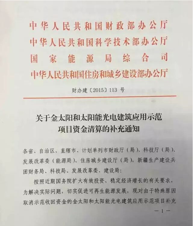 索比光伏网讯:近日,财政部、科技部、能源局、住建部联合下发《关于金太阳和太阳能光电建筑项目资金清算的补充通知》(财办建[2015]113)。