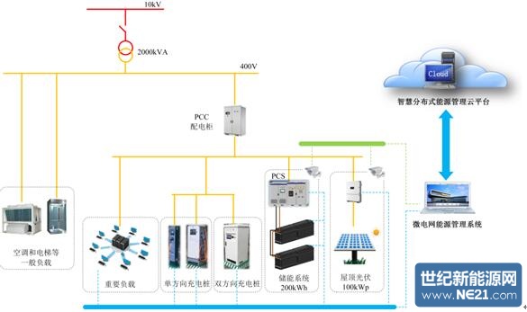 该微电网基于微电网能源管理系统,可对光伏发电量和负载用电量做短时预测,通过储能装置协调光伏和负载间的不平衡,避免由于光伏的波动和负载需求不确定导致的光伏利用率低。