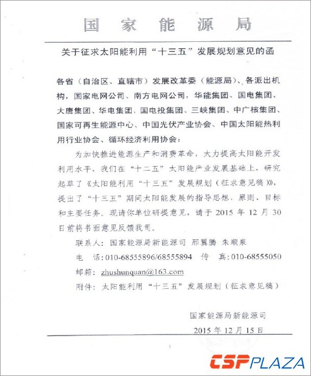 国家能源局于12月15日向各省(自治区、直辖市)发改委能源局等有关部门下发《太阳能利用十三五发展规划征求意见稿》(简称意见稿),要求于12月30日前将书面意见反馈至国家能源局新能源司。