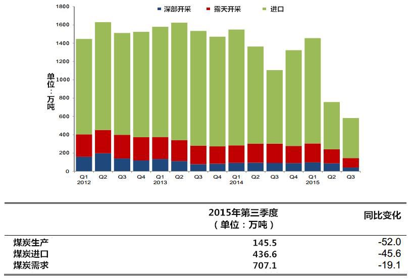 英国2015年第三季度当前能源数据显示,煤炭产量为150万吨油当量,同比降低52%,创历史新低。这主要是由于火力发电的需求减少以及一些可供开采的煤矿资源殆尽。